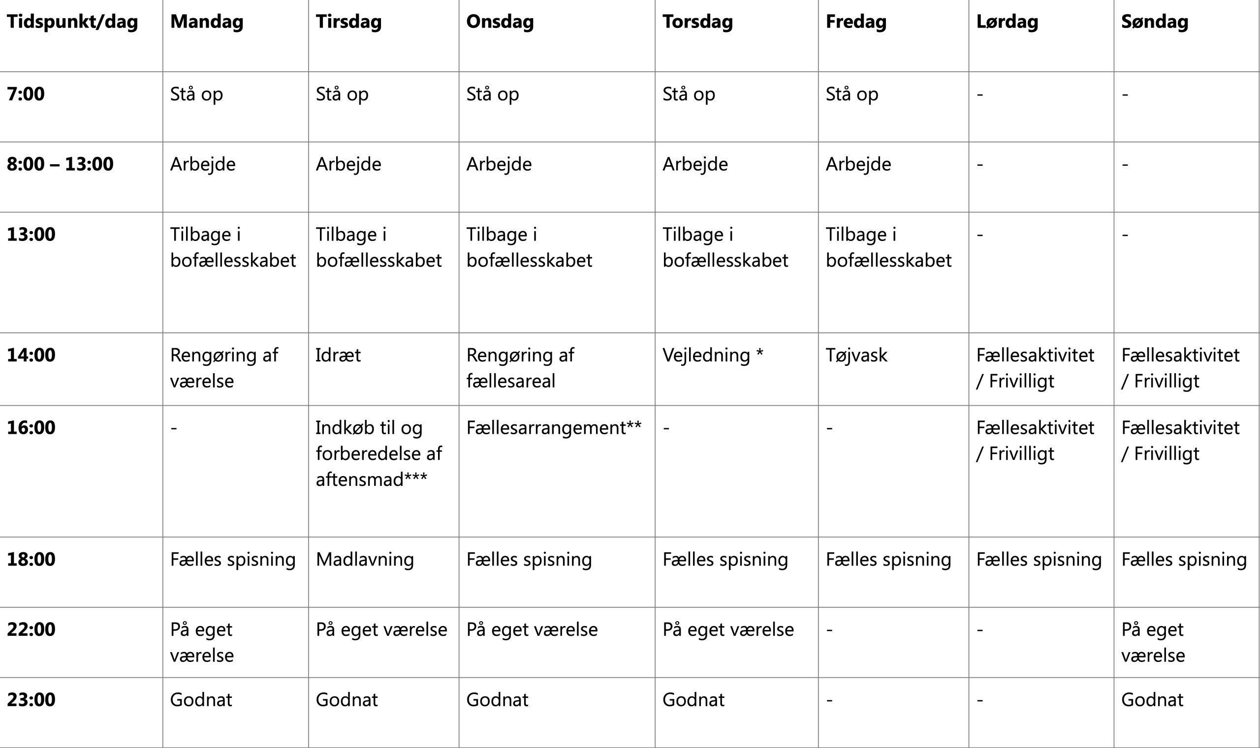 Én gang om ugen taler du og din vejleder om dine mål for uddannelsen, dine ADL-opgaver og gennemgang af E-boks og netbank.