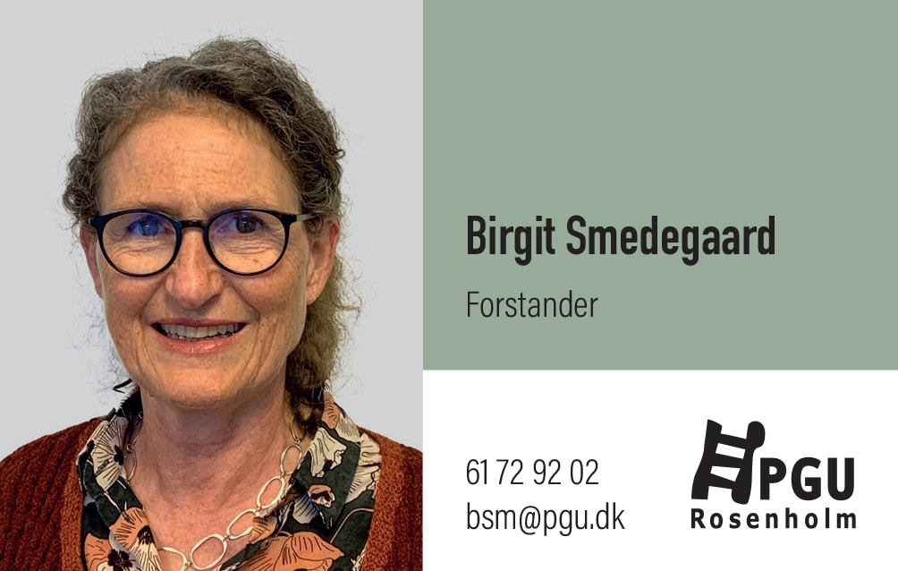 Du kan kontakte PGU Rosenholm: tlf.: 86 99 56 00 (hovednummer) tlf.: 61729202 (Forstander Birgit Smedegaard) Kontakt Har du spørgsmål til PGU Rosenholm? Du kan se en oversigt over vores personale her.